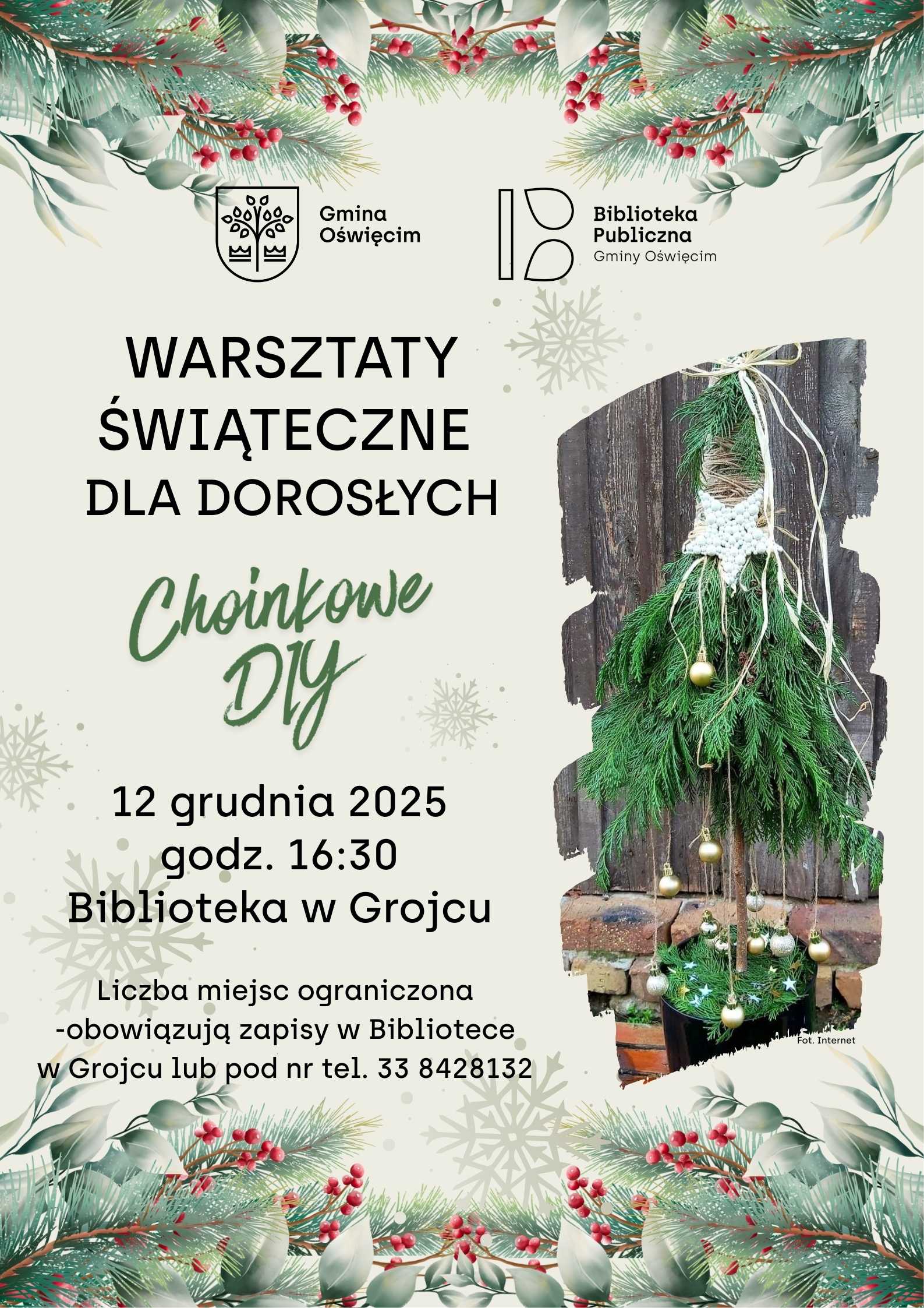 Biblioteka w Grojcu zaprasza osoby dorosłe na warsztaty tworzenia świątecznych choinek, które odbędą się 12 grudnia 2025 r o godzinie 16:30. W tym dniu biblioteka zamieni się w twórczy warsztat, w którym uczestnicy wykonają własne, dekoracyjne choinki.
