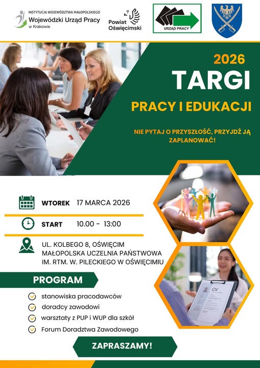 Nie pytaj o przyszłość – przyjdź ją zaplanować! Już 𝟭𝟳 𝗺𝗮𝗿𝗰𝗮 𝟮𝟬𝟮𝟲 𝗿. w Małopolskiej Uczelni Państwowej im. rtm. W. Pileckiego w Oświęcimiu, ul. Kolbego 8 odbędzie się wydarzenie dla wszystkich, którzy myślą o swojej karierze, edukacji i rozwoju.