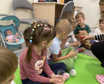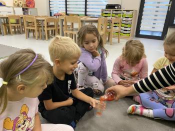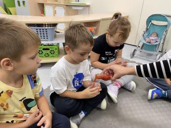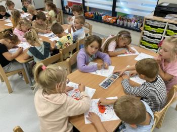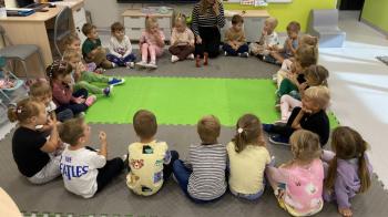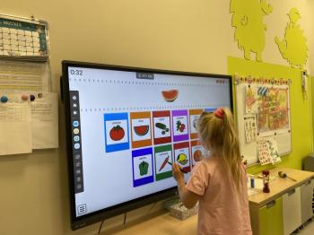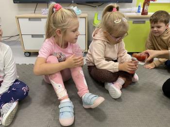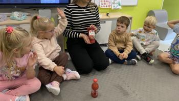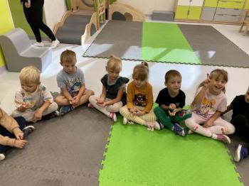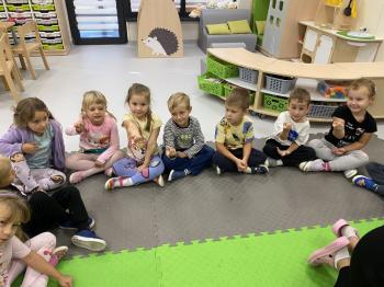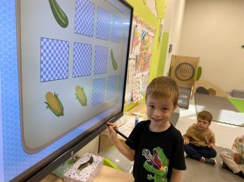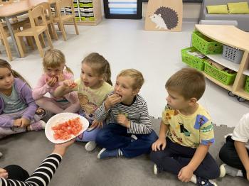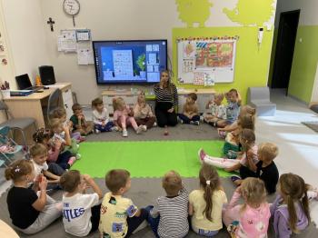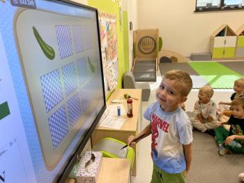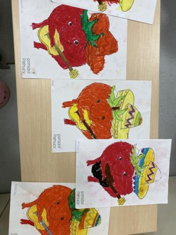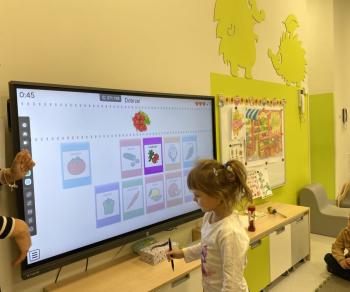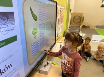 Podczas zajęć dzieci realizowały projekt „Witaminki” i poznały pierwsze warzywo – pomidora. Dowiedziały się, jak wygląda i smakuje pomidor, jakie ma odmiany, w jaki sposób się go sieje i pielęgnuje. Rozmawiały także o tym, jakie potrawy i przetwory można przygotować z pomidorów. Dzieci z radością uczestniczyły w grach edukacyjnych na tablicy multimedialnej oraz pokolorowali pierwszego poznanego bohatera.