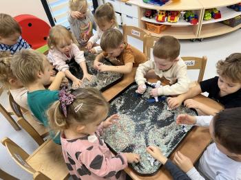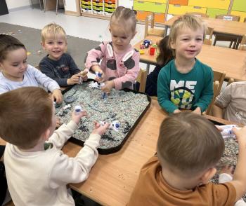 Za sprawą kolorowego, błyszczącego ryżu dzieci przeniosły się w magiczny świat planet, gwiazd i galaktyk. Każdy miał okazję tworzyć swój własny kosmiczny krajobraz, przesypywać, mieszać i odkrywać nieskończone możliwości zabawy sensorycznej.