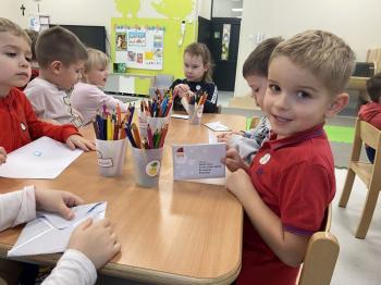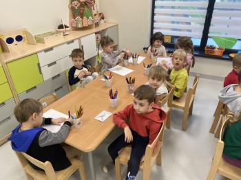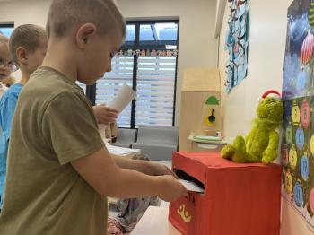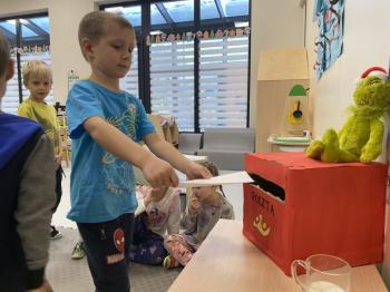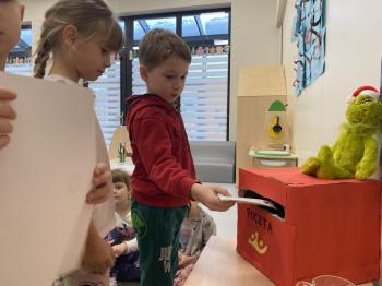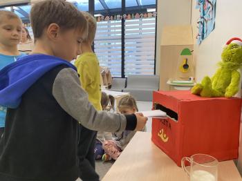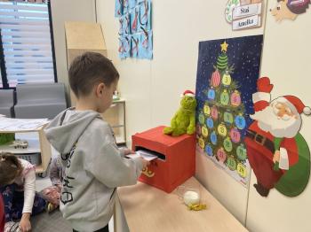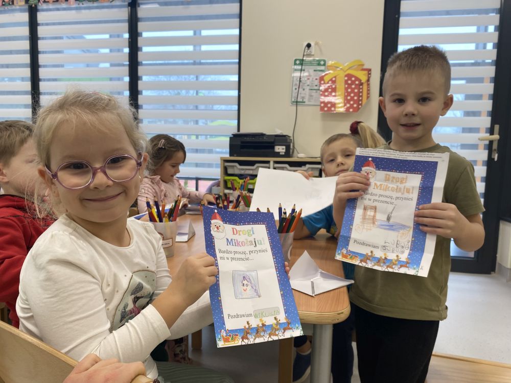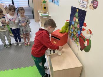 Dzieci przygotowały swoje listy do Świętego Mikołaja. Każdy stworzył własną kopertę oraz namalował w liście wymarzone prezenty. Następnie dzieci wrzuciły gotowe listy do specjalnej mikołajowej skrzynki. Na koniec poczęstowały Mikołaja małą słodkością i z niecierpliwością czekają, aż Mikołaj odwiedzi nasze przedszkole i zabierze wszystkie listy ze sobą.