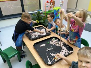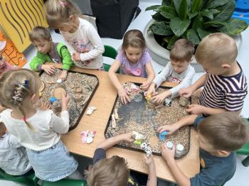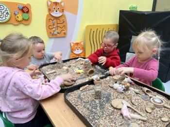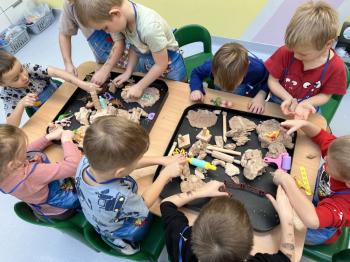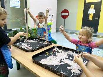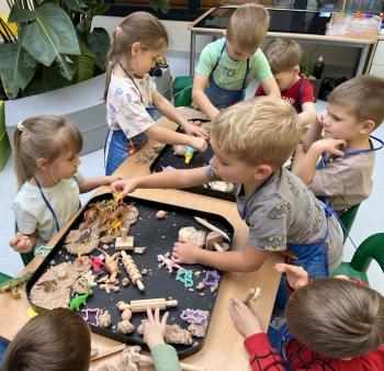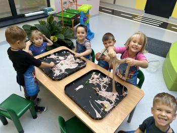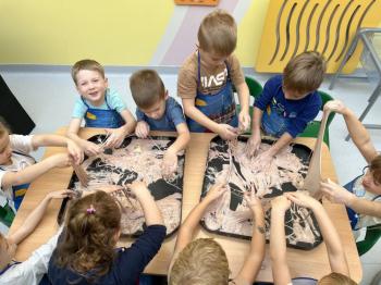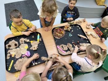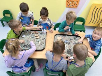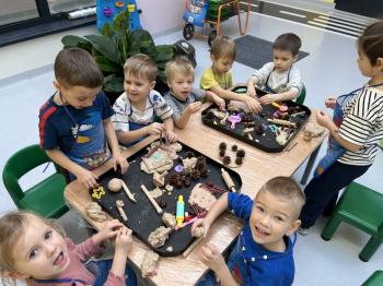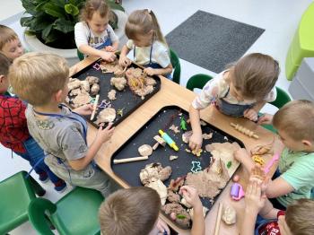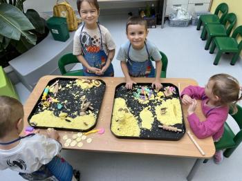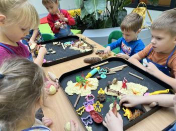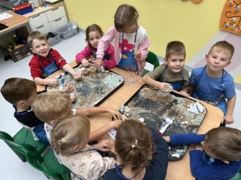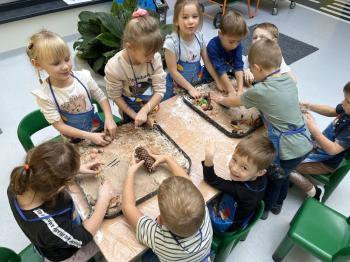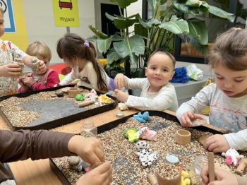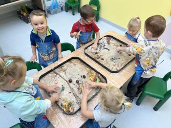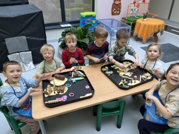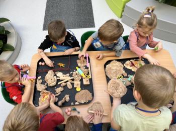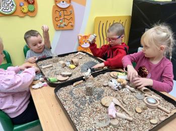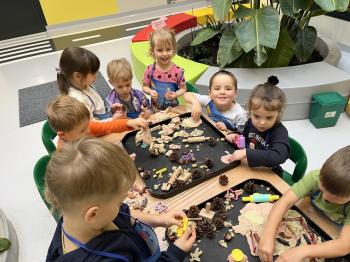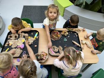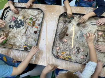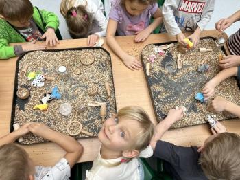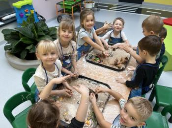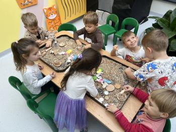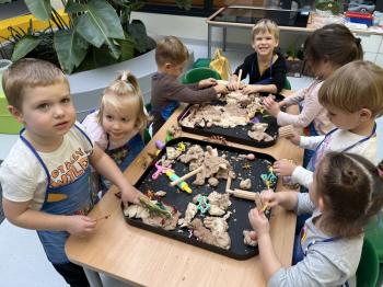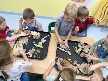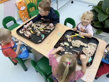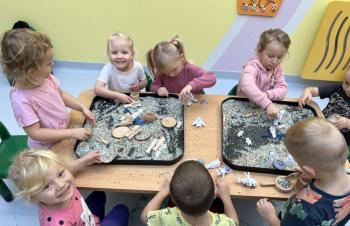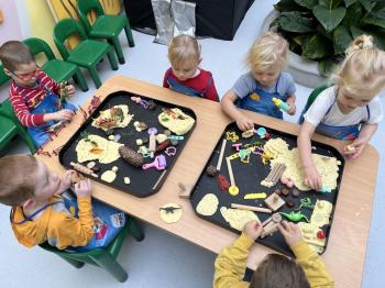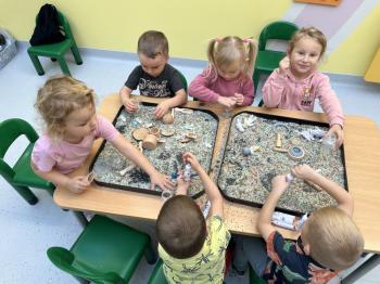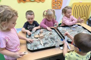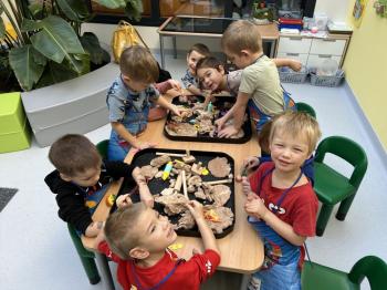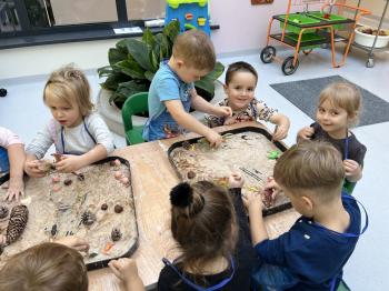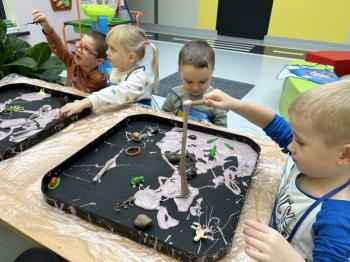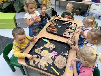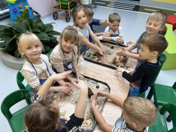 Nie zabrakło również jesiennego akcentu – przedszkolaki mogły zanurzyć dłonie w kasztanowej masie, tworząc w niej przeróżne kompozycje i budując „kasztanowy świat”. Z kolei miłośnicy dinozaurów byli zachwyceni, gdy na zajęciach pojawiła się błotna kraina prehistorycznych stworzeń. Naturalne materiały pozwoliły na swobodną zabawę tematyczną i rozwój wyobraźni przestrzennej.