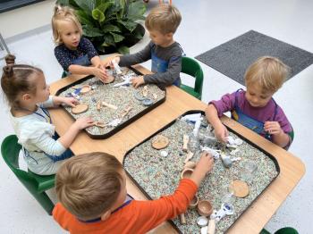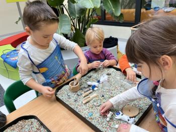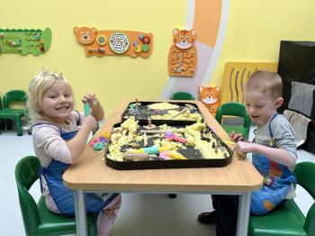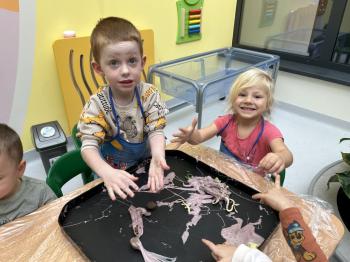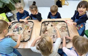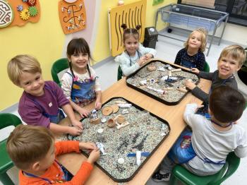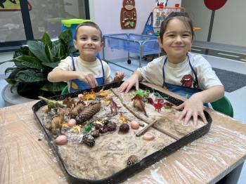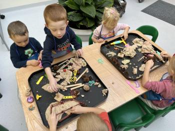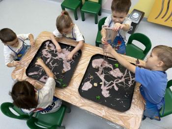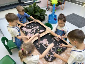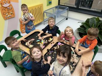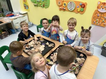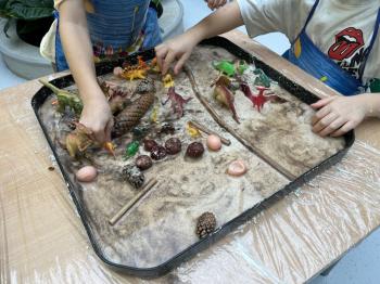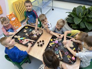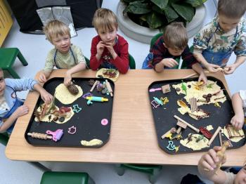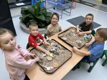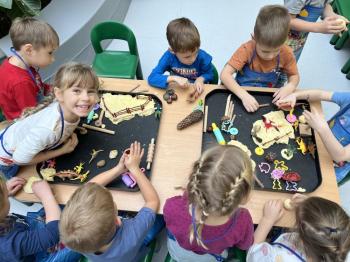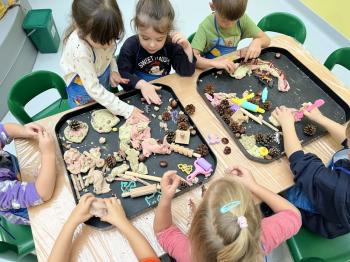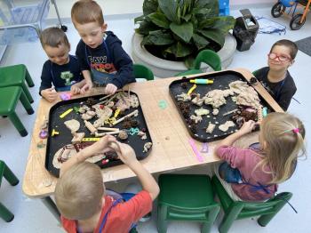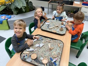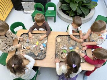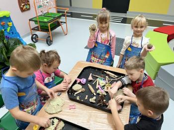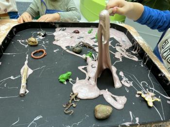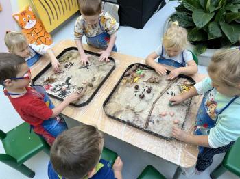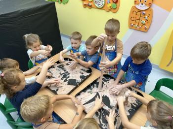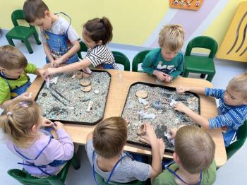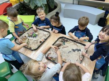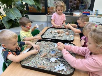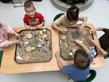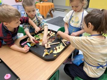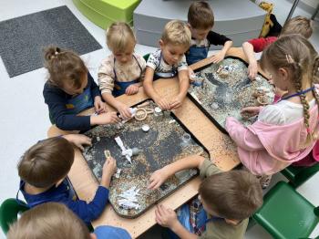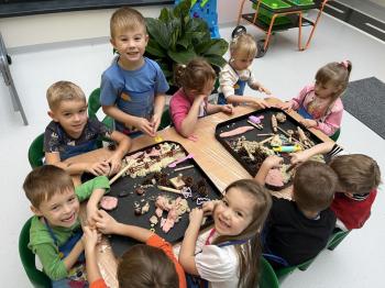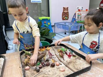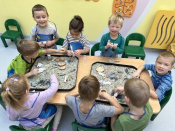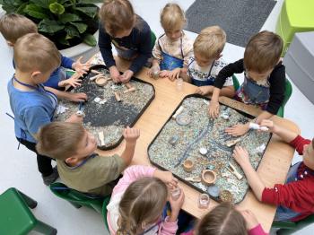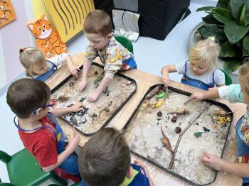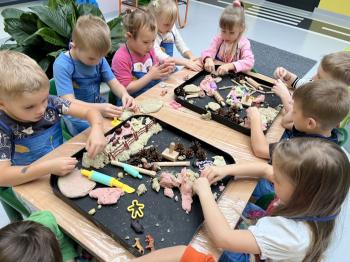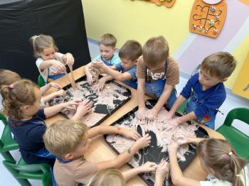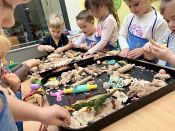 Nie zabrakło również jesiennego akcentu – przedszkolaki mogły zanurzyć dłonie w kasztanowej masie, tworząc w niej przeróżne kompozycje i budując „kasztanowy świat”. Z kolei miłośnicy dinozaurów byli zachwyceni, gdy na zajęciach pojawiła się błotna kraina prehistorycznych stworzeń. Naturalne materiały pozwoliły na swobodną zabawę tematyczną i rozwój wyobraźni przestrzennej.