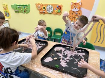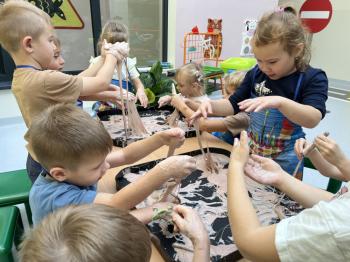 Kolejne zadanie budziło ogromne emocje – poznaliśmy Slime, czyli masę o wyjątkowo rozciągliwej i elastycznej konsystencji. Dzieci z zaangażowaniem sprawdzały, jak daleko można go rozciągnąć, ugniatać i formować, ćwicząc tym samym wrażliwość dotykową oraz cierpliwość.
