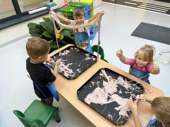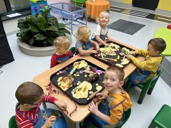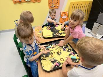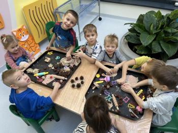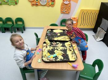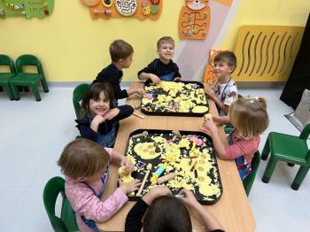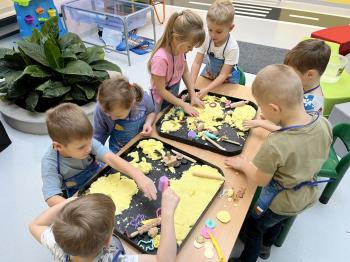 W ramach obchodów Dnia Pluszowego Misia dzieci stworzyły dla swoich pluszaków wyjątkową, barwną przestrzeń do zabawy. Na zajęciach pojawiła się również masa ziemniaczana, która zachwyciła dzieci miękką konsystencją i możliwościami formowania. Na zakończenie sensorycznej przygody przedszkolaki mogły poczuć cytrusowy zapach ciastoliny, który wprowadził w sali świeżość i poprawił wszystkim nastrój.