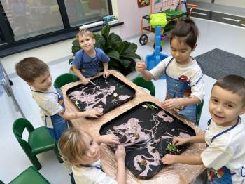 W ramach zajęć sensorycznych oraz zabaw stymulujących rozwój zmysłów nasze grupy projektowe wyruszyły w pełną wrażeń podróż, podczas której każdy mógł doświadczać świata wszystkimi zmysłami. Był to czas odkrywania, eksperymentowania, rozwijania wyobraźni i przede wszystkim – świetnej zabawy.