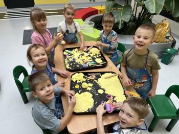 Pierwszym przystankiem był kosmiczny świat świecącego ryżu, który zachwycił dzieci swoimi barwami i fakturą. Przedszkolaki mogły przesypywać ryż, mieszać go, tworzyć kompozycje i z zaciekawieniem obserwować, jak zmienia się w świetle. Zaraz po tym przyszła pora na kreatywne działanie – dzieci przygotowały domową ciastolinę, a następnie stworzyły z niej własne, kolorowe krainy. To doskonała okazja do rozwijania małej motoryki oraz umiejętności planowania i tworzenia.