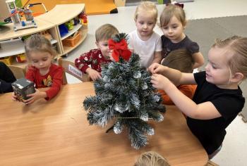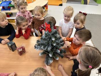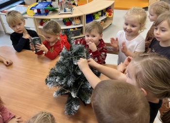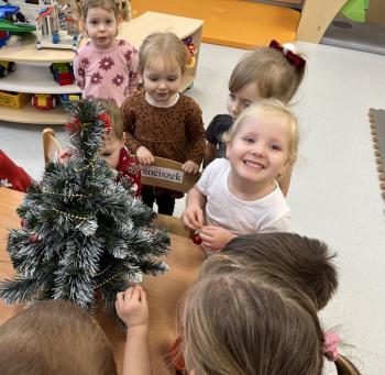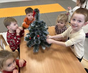 Wspólne ubieranie choinki było nie tylko okazją do świetnej zabawy, ale także do integracji grupy, rozwijania kreatywności oraz kultywowania pięknych świątecznych tradycji. W sali od razu zrobiło się przytulnie. Choinka już dumnie stoi i wprowadza nas w klimat zbliżających się Świąt.