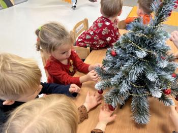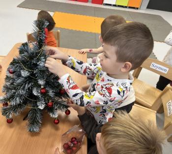 W grupie Biedronek zapanował prawdziwie magiczny, świąteczny nastrój! Nasze przedszkolaki z ogromnym zaangażowaniem i radością udekorowały przedszkolną choinkę. Dzieci starannie wybierały bombki, zawieszały kolorowe łańcuchy, dzięki czemu drzewko wygląda wyjątkowo i niepowtarzalnie.