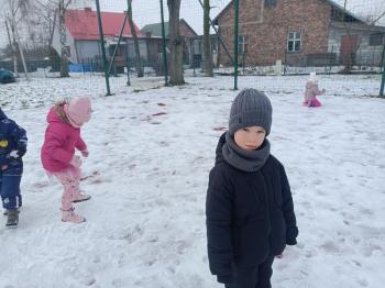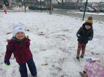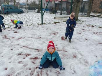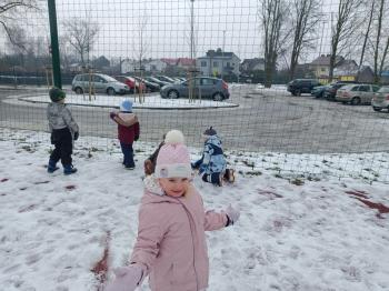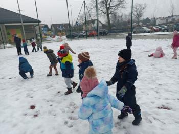 Korzystając z uroków zimy przedszkolaki z grupy Rybek bawiły się wspólnie na śniegu. Dzieci lepiły kule śniegowe, rzucały śnieżkami oraz odbijały na śniegu „aniołki”. Zimowemu pobytowi na świeżym powietrzu towarzyszyły również zabawy ruchowe: Taniec pingwinów oraz zamarzanie. Wszyscy doskonale się bawili wykorzystując walory pobytu na świeżym powietrzu.