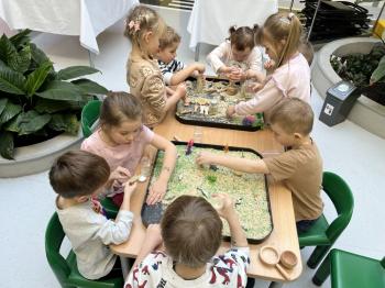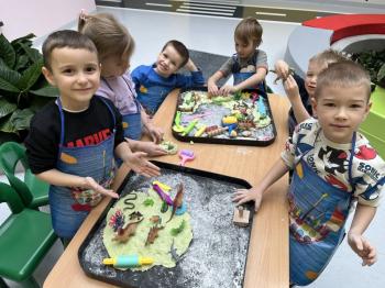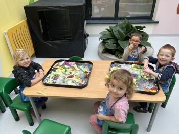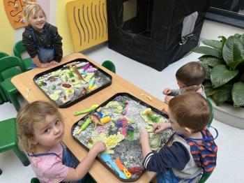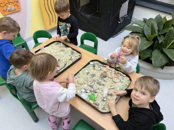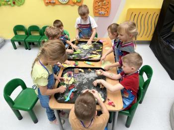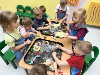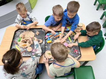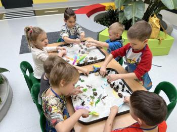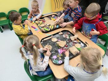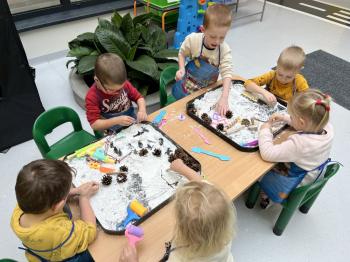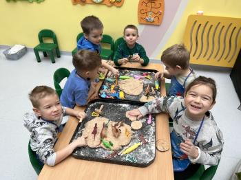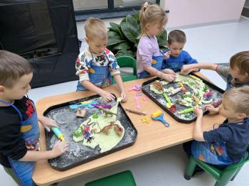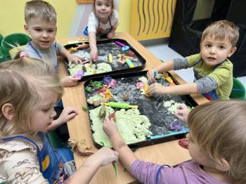 Nie zabrakło także fascynującej wyprawy do lodowej krainy dinozaurów, gdzie zabawa łączyła się z elementami odkrywania i swobodnej eksploracji. Kolejnym sensorycznym przystankiem była masa z kaszy manny – mannolina, która pozwoliła dzieciom ugniatać, formować, wałkować i rozwijać sprawność dłoni oraz koordynację ruchową.