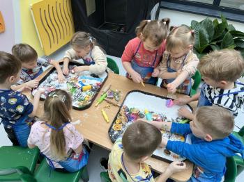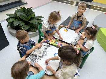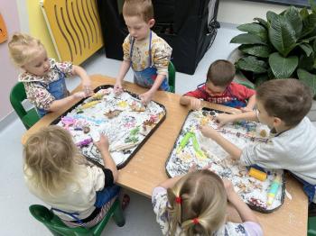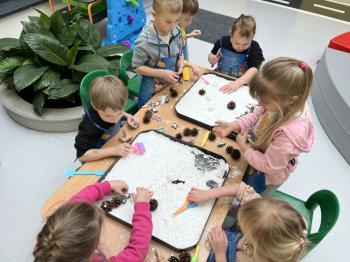 Dzieci poznawały kolory zimy — biel, błękit i srebro, obserwując ich połączenia i ucząc się rozróżniania barw poprzez dotyk i wzrok. Szczególną radość sprawiło im magiczne śnieżne doświadczenie, gdy każdy mógł poczuć „śnieg” w swojej dłoni i sprawdzić, jak zmienia się pod wpływem dotyku.