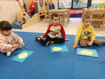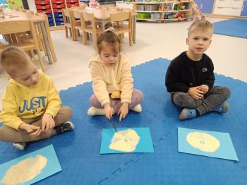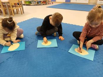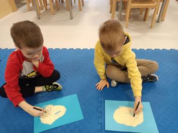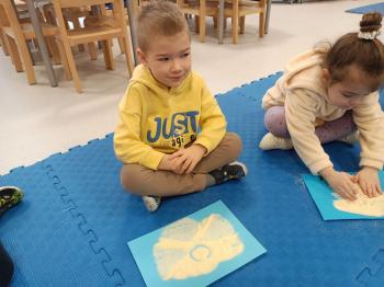 Grupa Rybki zrealizowała kolejne zadanie w ramach projektu edukacyjnego "Małe rączki - wielkie możliwosci czyli sensoryczna droga do sprawności". Zachowując tematykę zimową wykorzystaliśmy do zabaw kaszę mannę. Dzieci wodziły palcem tworząc zimowe symbole. Sypkość kaszy pozwoliła na stworzenie ciekawych elementów. Przedszkolaki dzięki tej zabawie rozwijały sprawność manualną oraz zmysł dotyku.