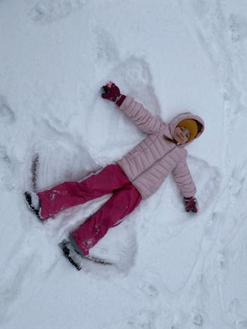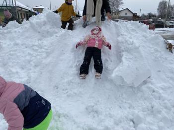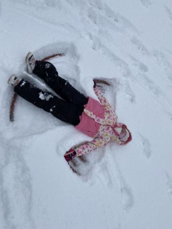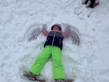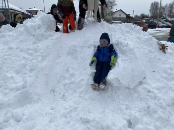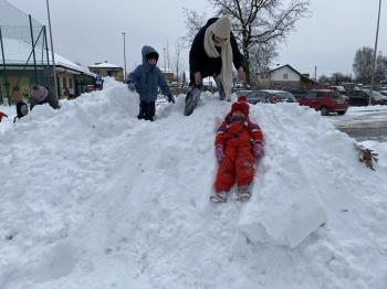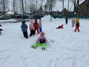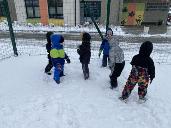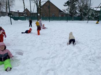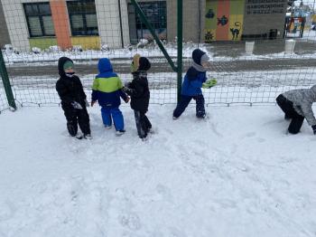 Grupa Jeżyki korzystała z zimowej pogody i wspaniale bawiła się na śniegu. Dzieci z radością lepiły różne śnieżne figurki, urządziły wesołą bitwę na śnieżki, a także zjeżdżały z górki. Nie zabrakło również robienia aniołków na śniegu.