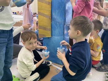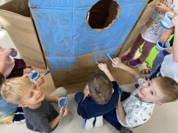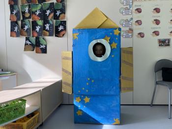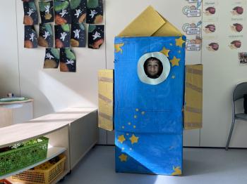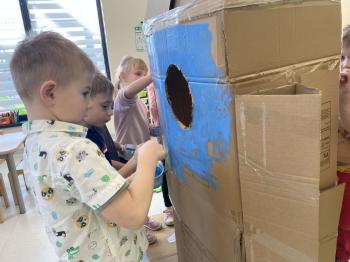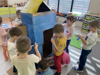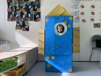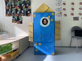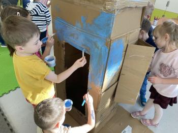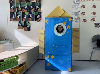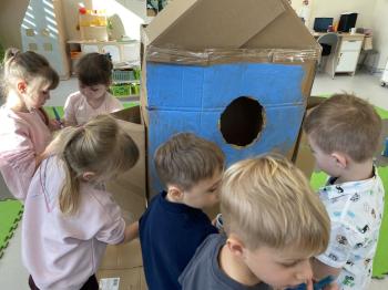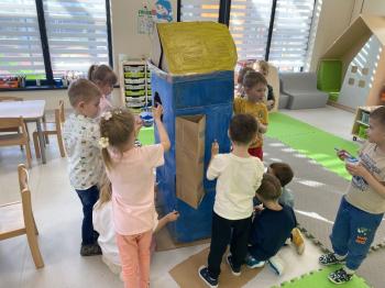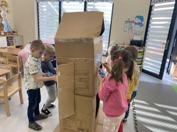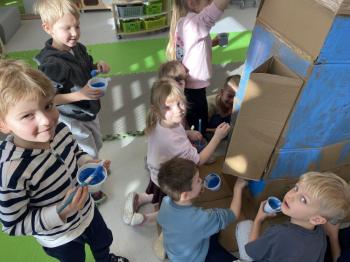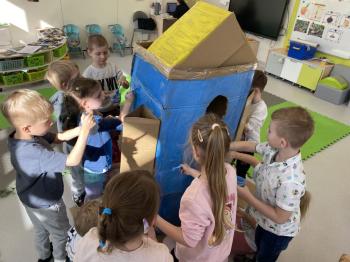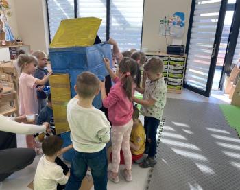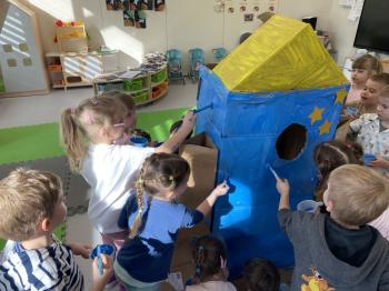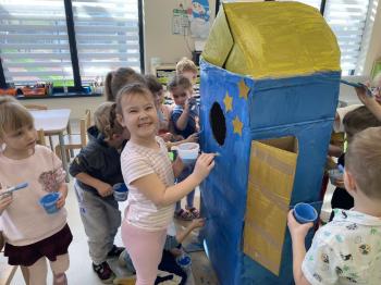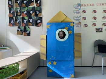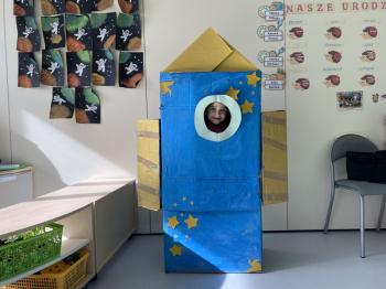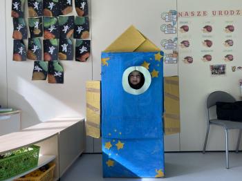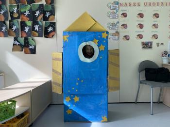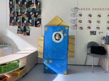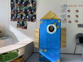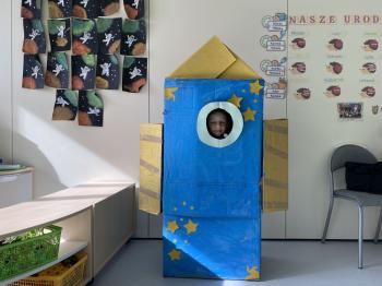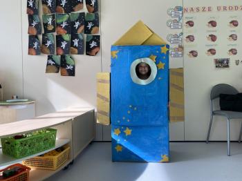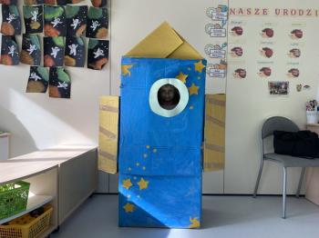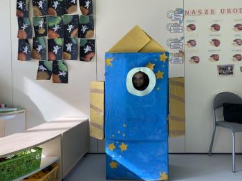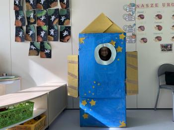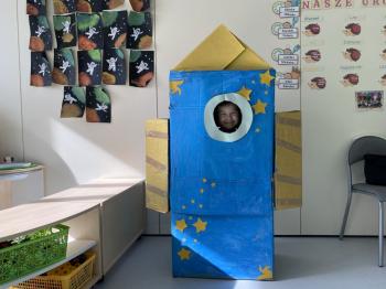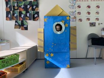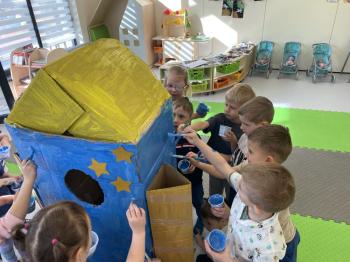 Podczas zajęć o kosmosie grupa Jeżyki samodzielnie stworzyła własną rakietę kosmiczną. Dzieci wspólnie projektowały i przygotowywały jej elementy, wykazując się dużym zaangażowaniem.