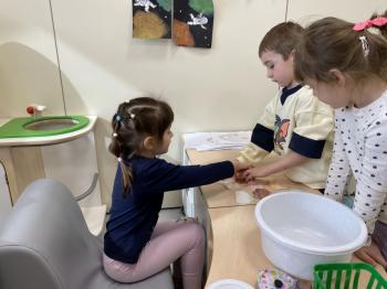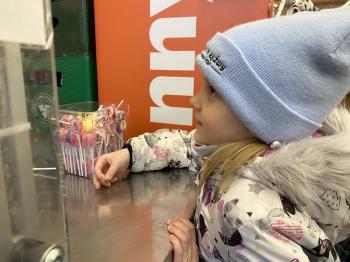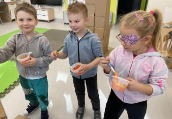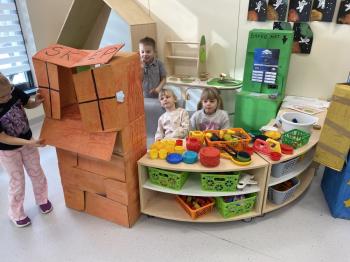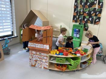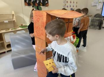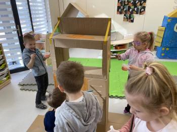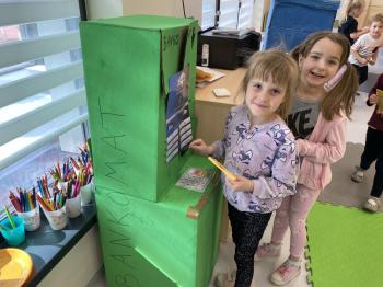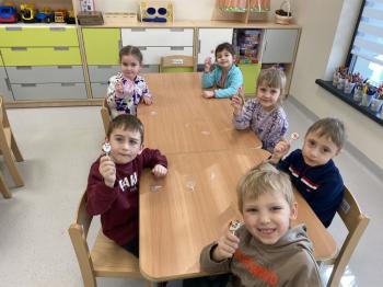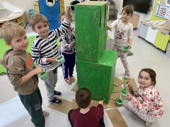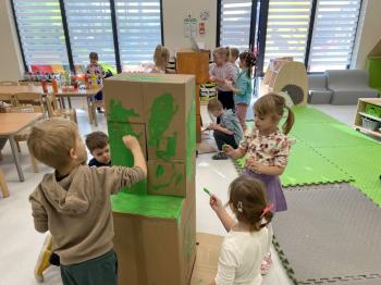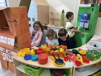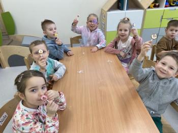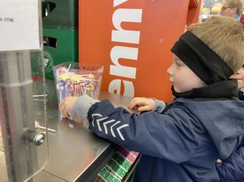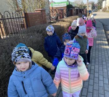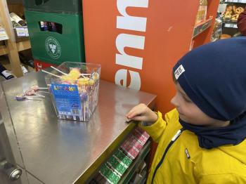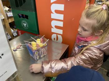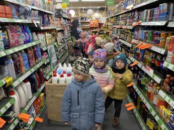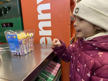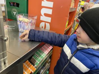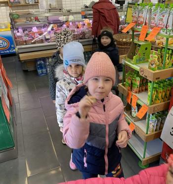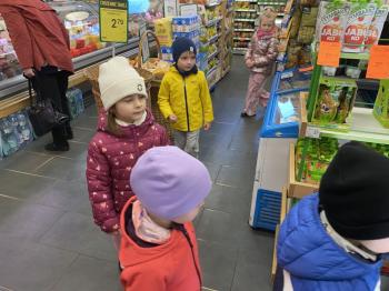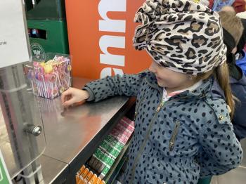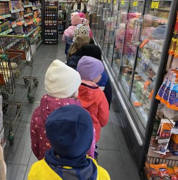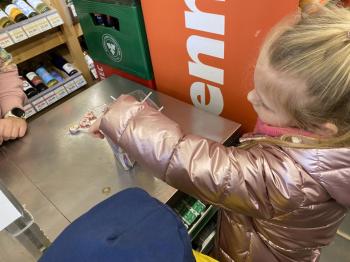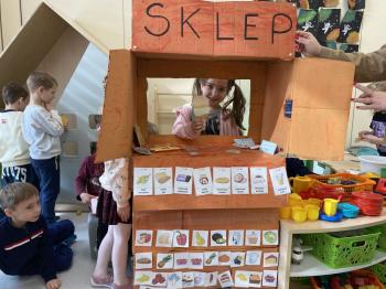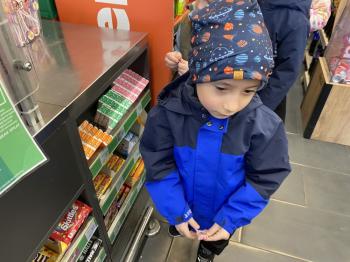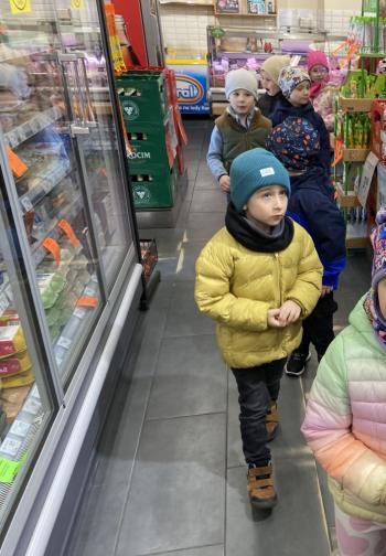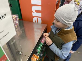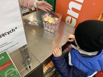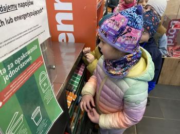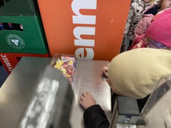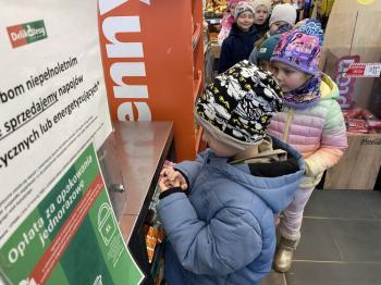 Grupa „Jeżyki” podczas realizacji tematyki zajęć „W sklepie” udała się na zakupy do pobliskiego sklepu. Każdy samodzielnie wybrał produkt oraz zapłacił za niego przy kasie pamiętając o zwrotach grzecznościowych ważnych podczas robienia zakupów.