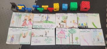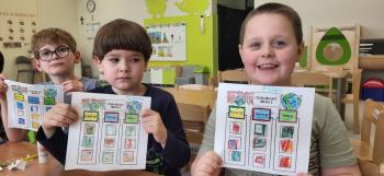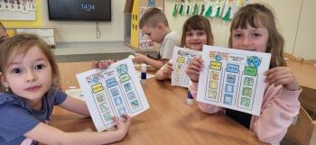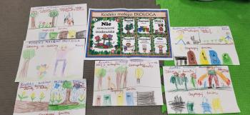 Temat drugi obejmował zagadnienia: po co segregujemy odpady, zapoznanie ze znaczeniem kolorowych pojemników, wprowadzono zasady małego ekologa.