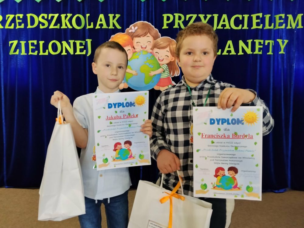 23 kwietnia w Przedszkolu Samorządowym we Włosienicy odbyła się XVIII edycja Gminnego Konkursu Ekologicznego pod tytułem ,,Przedszkolak Przyjacielem Zielonej Planety’’, pod patronatem honorowym Wójta Gminy Oświęcim. Nasze przedszkole reprezentowali Franciszek Burdyl i Jakub Paszek z grupy Kotki, którzy zaprezentowali piosenkę ekologiczną pt. ,,Ziemia choruje’’, a następnie doskonale poradzili sobie ze wszystkimi zadaniami konkursowymi.