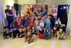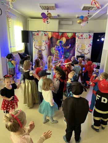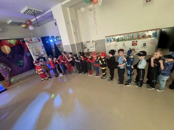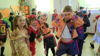 Tego dnia  już od rana w przedszkolu pojawiały się kolorowe postacie.W salach przedszkolnych można było spotkać między innymi: wróżki, królewny, rycerzy, piratów, superbohaterów, nie sposób zliczyć i wymienić tych wszystkich  postaci.  Wystrój sali wprowadził w radosny nastrój oraz zachęcał wszystkich do wesołej zabawy.  Kiedy pojawiły się pierwsze rytmy wesołej muzyki wszyscy z wielką ochotą rozpoczęli pląsy i tańce. Dzieci bawiły się znakomicie. A naszą wspaniałą zabawę umilił nam Pan Humorek.