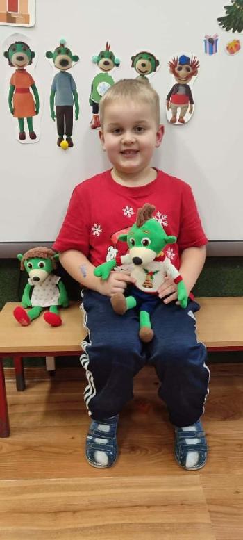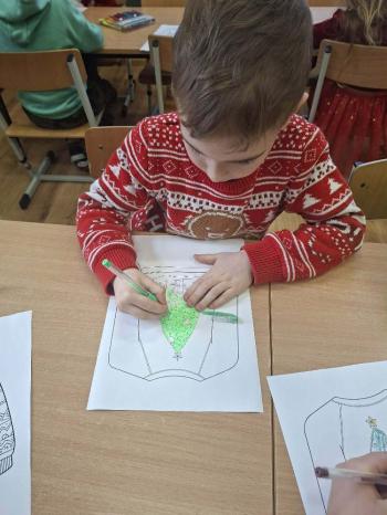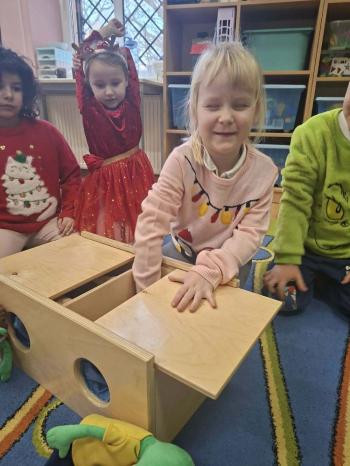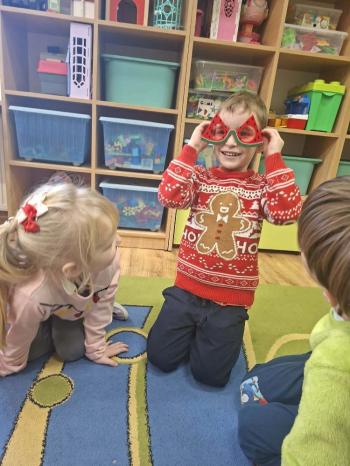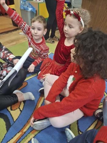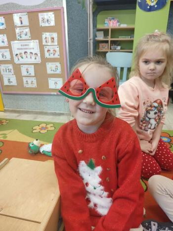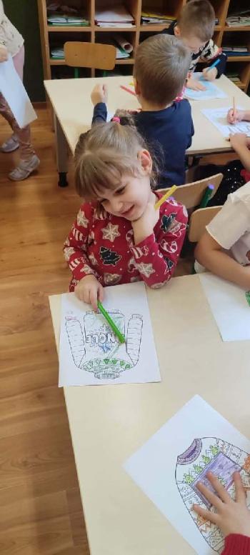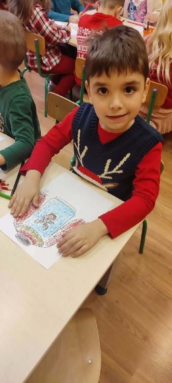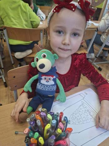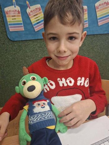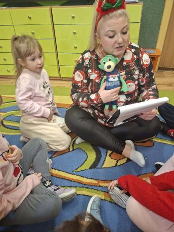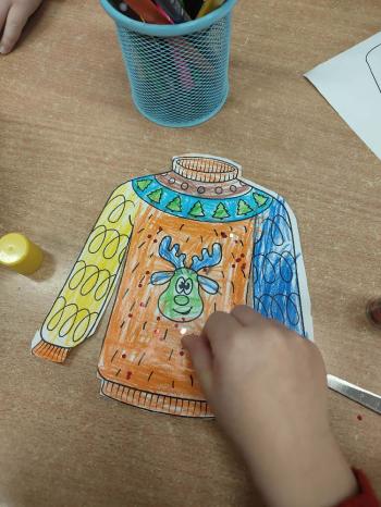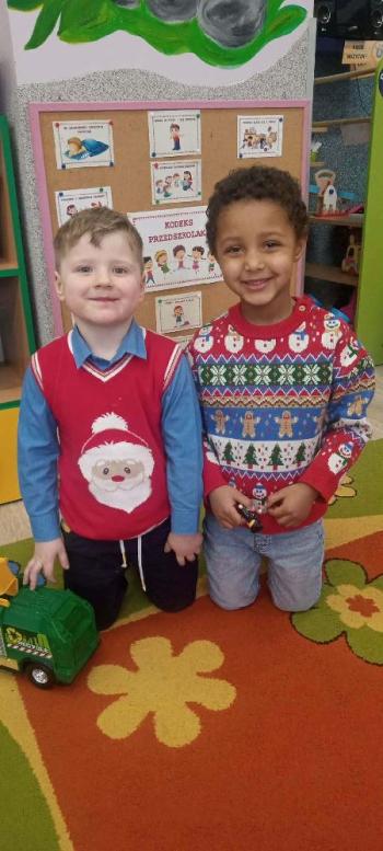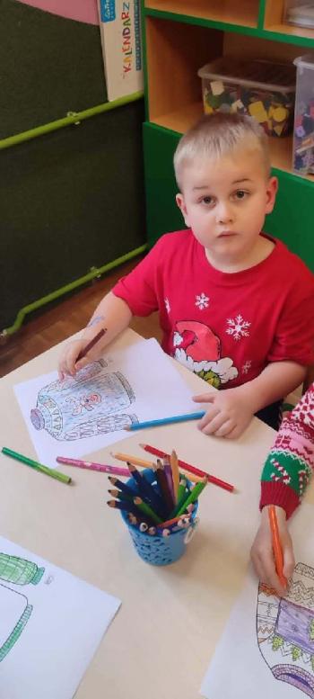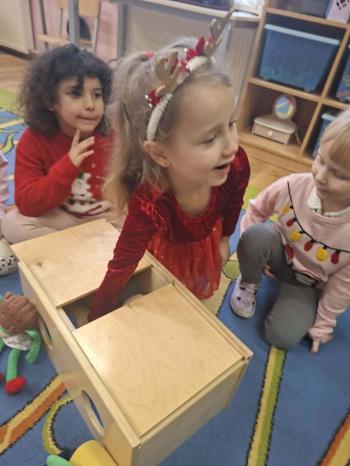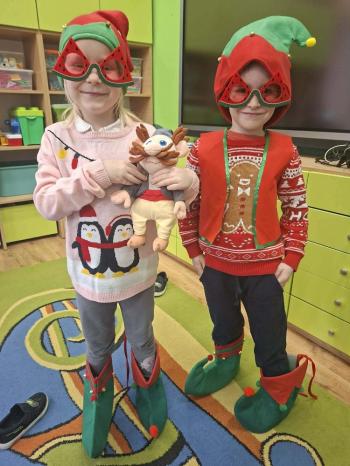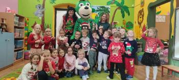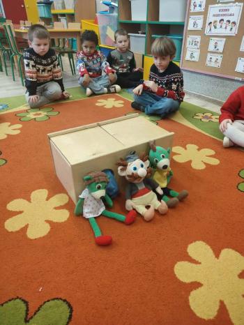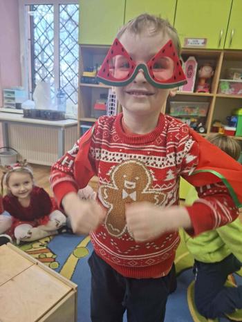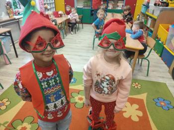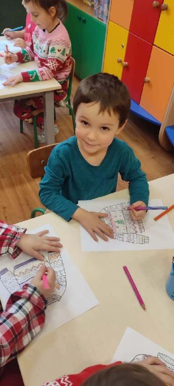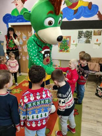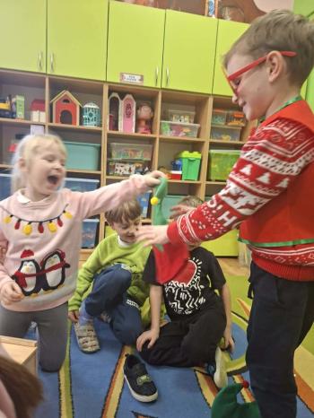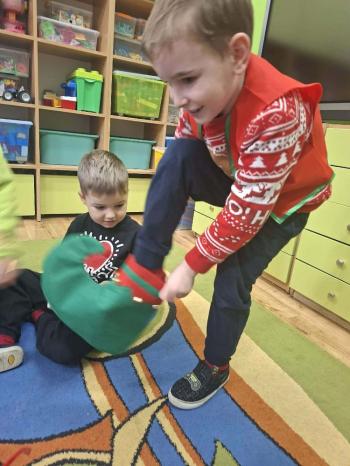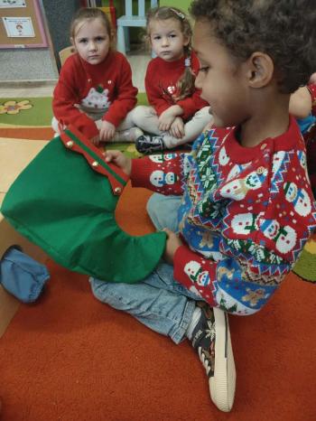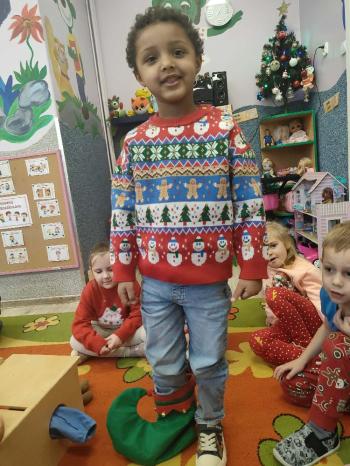 i innymi bożonarodzeniowymi motywami. Nawet nasze maskotki założyły świąteczne sweterki. Dzieci brały udział w zabawach ze skrzynią, kolorowały i ozdabiały sweterki, słuchały opowiadania czytanego przez nauczyciela, a także śpiewały piosenkę autorstwa Pani dyrektor Jolanty Zapały "Magiczny sweterek"