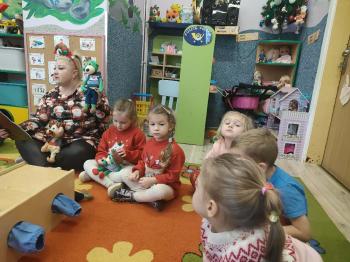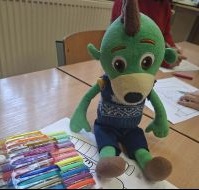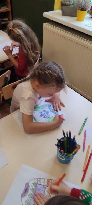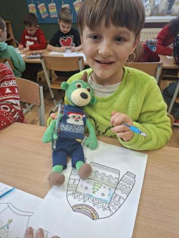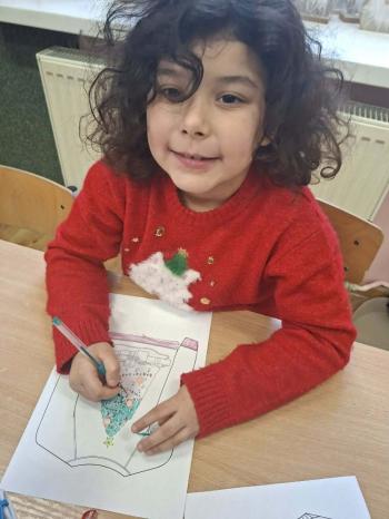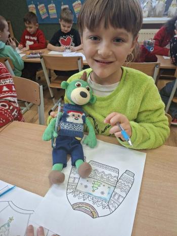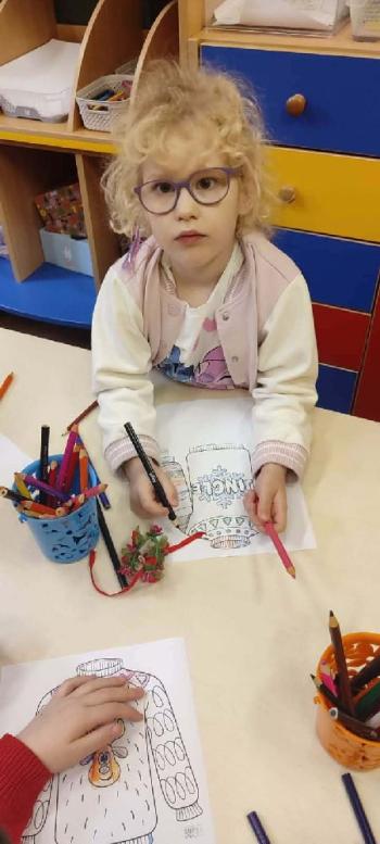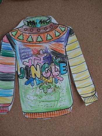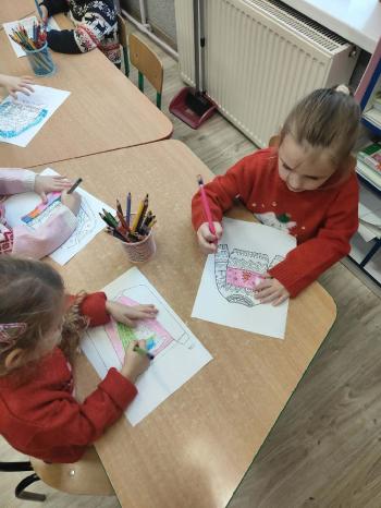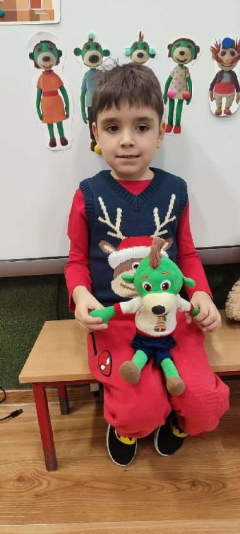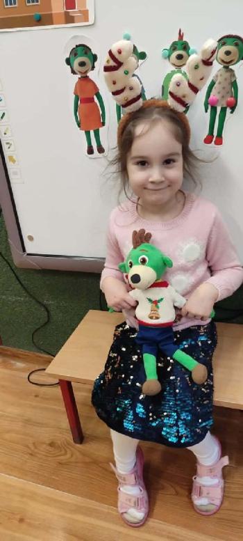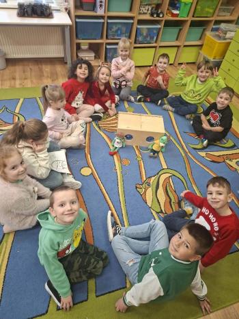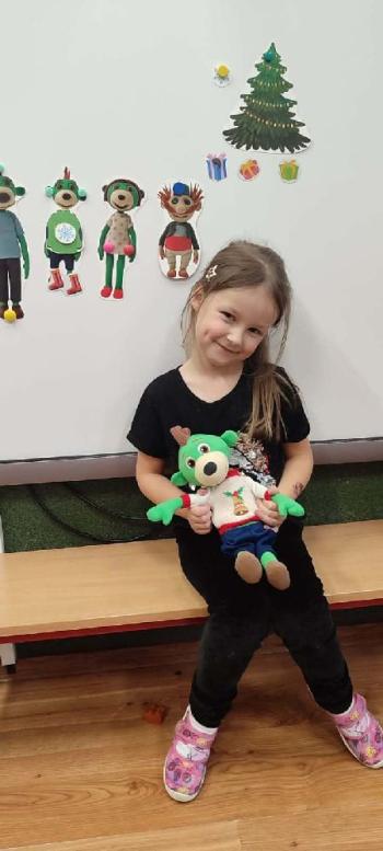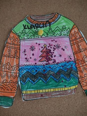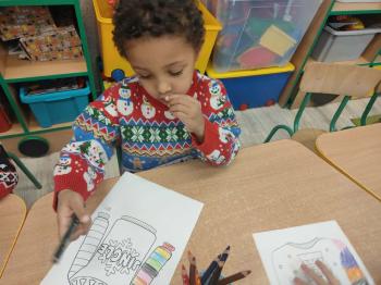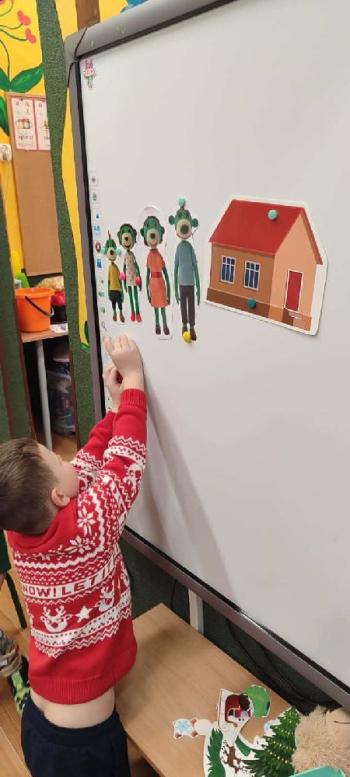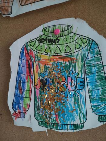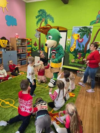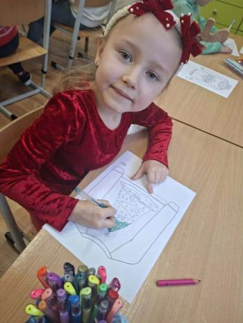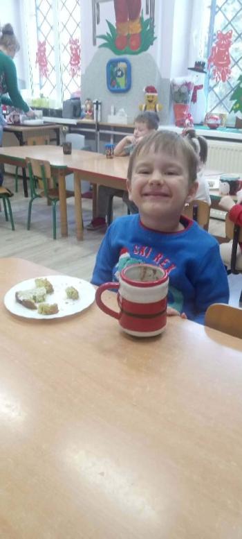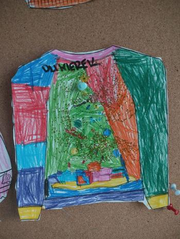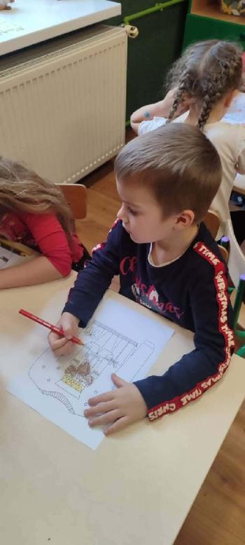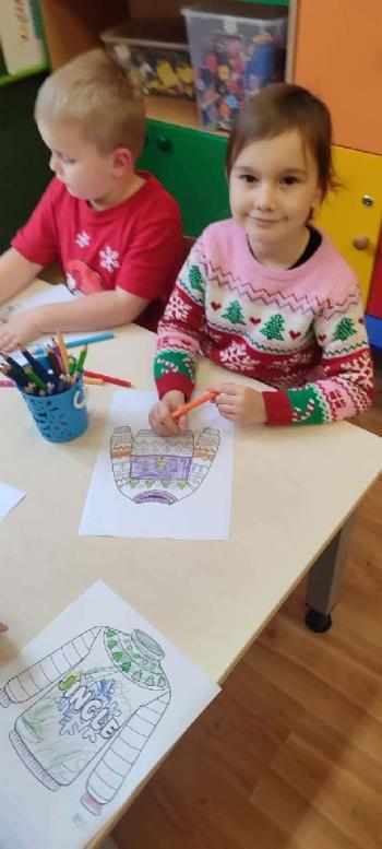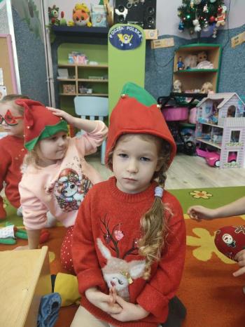 i innymi bożonarodzeniowymi motywami. Nawet nasze maskotki założyły świąteczne sweterki. Dzieci brały udział w zabawach ze skrzynią, kolorowały i ozdabiały sweterki, słuchały opowiadania czytanego przez nauczyciela, a także śpiewały piosenkę autorstwa Pani dyrektor Jolanty Zapały "Magiczny sweterek"