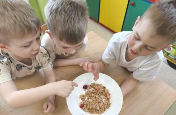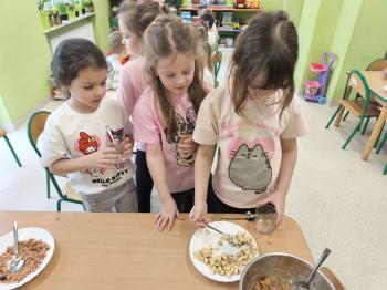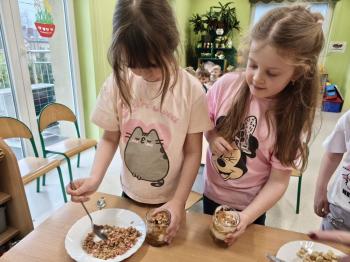Marcowe zajęcia podczas realizacji innowacji pedagogicznej „Klub Zdrowego Łasucha” w grupie Pszczółek, zachęciły nas do degustacji granoli z owocami. Ten szybki w wykonaniu deser, spośród wszystkich dotychczas przygotowanych przez Pszczółki posiłków, stanowczo najbardziej zadowolił wymagające podniebienia naszych najstarszych przedszkolaków. Po przygotowaniu wszystkich niezbędnych składników, dzieci samodzielnie nakładały kolejne warstwy deseru, by cieszyć się orzeźwiającym smakiem połączenia jogurtu z musem jabłkowym, kawałkami banana i granoli.