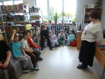 Dzieciaki chętnie odpowiadały na pytania pani bibliotekarki np. jakie książki czytają, czy warto czytać, czy często wypożyczają książki i czy lubią czytać. Spotkanie miało na celu przybliżenie najmłodszym roli biblioteki w życiu szkoły, zachęcenie do czytania książek oraz rozwijanie zainteresowań czytelniczych.
