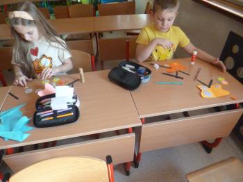 Podczas zajęć dzieci słuchały również piosenek o motylach, które wprowadziły radosny nastrój. Uczniowie chętnie rozwiązywali zadania interaktywne dotyczące motyli na platformie wordwall, utrwalając zdobytą wiedzę w formie zabawy. W części plastycznej dzieci wykonały motyle z przygotowanych szablonów. Ozdabiały je według własnych pomysłów papierem kolorowym oraz innymi materiałami plastycznymi. Gotowe prace zostały zaprezentowane na wystawie świetlicowej.