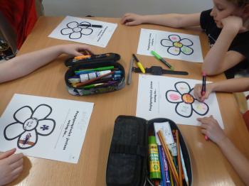 W dalszej części zajęć uczniowie otrzymali kartę pracy „Pozytywny kwiat – jestem ważny, bo…”. Ich zadaniem było zapisanie lub narysowanie na płatkach kwiatu cech i wartości, które w sobie lubią i cenią. Następnie dzieci, siedząc w kręgu, omawiały swoje prace, dzieląc się refleksjami.