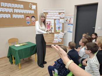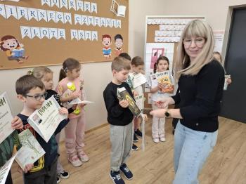 Pani Marta Zając z Biblioteki Publicznej w Grojcu uroczyście wręczyła Kacprowi książkę Smocze jajo autorstwa Pawła Gołucha. Publikacja ta posłuży mu do przygotowań do nadchodzącego konkursu, w którym uczestnicy będą prezentować swoje umiejętności czytania na głos, interpretując fragmenty właśnie z tej lektury.