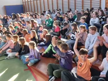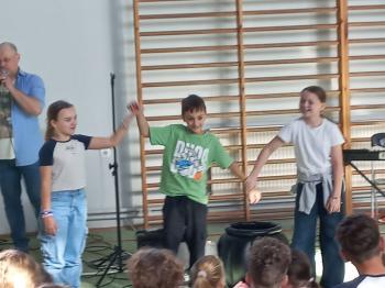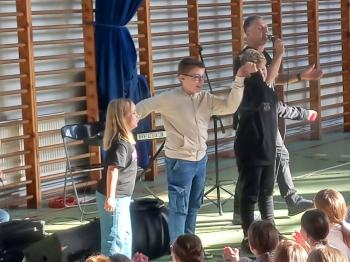 Tym razem w interesujący sposób opowiedzieli o muzyce rozrywkowej, jej historii i kierunkach rozwoju. Mieliśmy wszyscy okazję uczestniczyć w muzycznej podróży począwszy od czasów, kiedy Krzysztof Kolumb odkrył Amerykę, do czasów współczesnych. Poznaliśmy gatunki muzyczne takie jak: ballada angielska, negro spirituals, work songs, shanties, blues i rock and roll. Do udziału na scenie zostali zaproszeni również uczniowie, którzy rytmicznie inscenizowali prezentowane piosenki oraz pomagali w miksowaniu gatunków muzycznych, czego efektem było wybuchowe narodzenie się jazzu. Nie zabrakło wspólnych śpiewów, a w finale tego żywiołowego programu pojawiły się również popularne przeboje z ostatnich lat. Z niecierpliwością czekamy, co nowego panowie zaprezentują za rok.