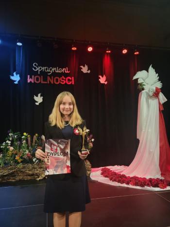 Wśród wielu uczestników zaprezentowała się również Maja Kędracka, uczennica klasy szóstej naszej szkoły. Swoją wzruszającą interpretacją piosenki Rozkwitały pąki białych róż Maja ujęła za serca członków komisji konkursowej, która przyznała jej trzecią nagrodę. Gratulujemy i życzymy kolejnych sukcesów.