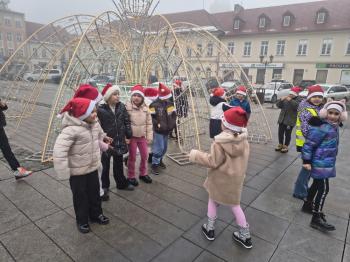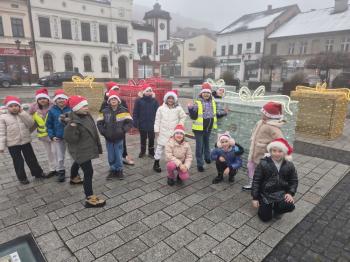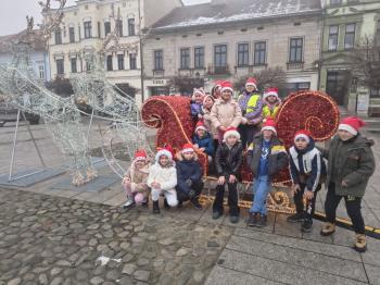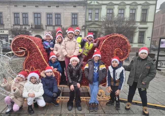 Ubrani w czerwone czapeczki drugoklasiści odwiedzili Rynek w Oświęcimiu, gdzie zrobili sobie pamiątkowe zdjęcia w saniach Mikołaja, zaprzężonych w piękne renifery.
