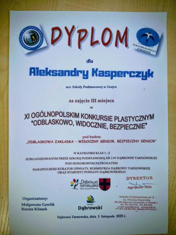 Uczennica klasy 2a, Aleksandra Kasperczyk zajęła III miejsce w XI Ogólnopolskim Konkursie Plastycznym "Odblaskowo, widocznie, bezpiecznie".