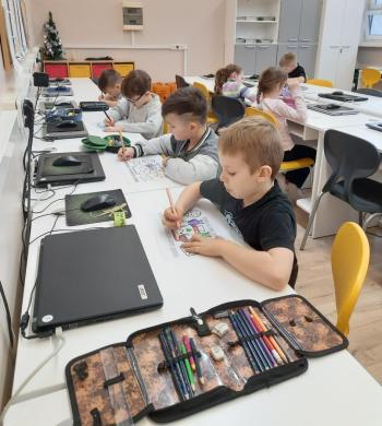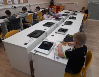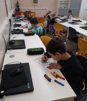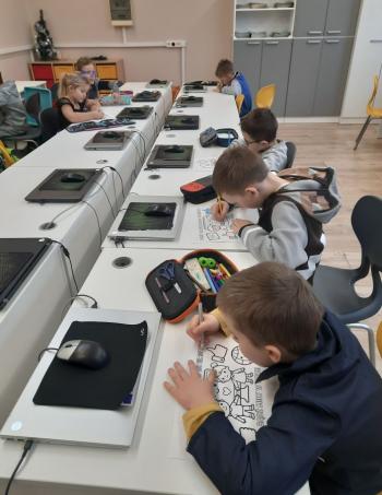 Najmłodsi uczniowie – klasy pierwsze – podczas lekcji informatyki kolorowali tematyczne kolorowanki oraz rozmawiali o podstawowych zasadach bezpiecznego zachowania w Internecie. Zajęcia miały formę zabawy, ale jednocześnie pozwoliły dzieciom zrozumieć, jak ważna jest ostrożność w świecie online.